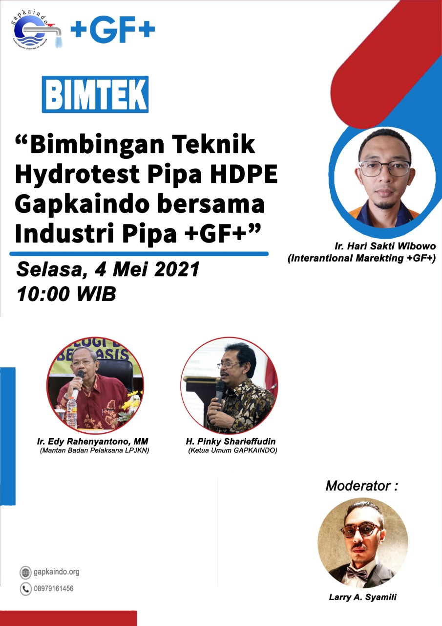 Undangan Zoom Bimbingn teknik Hydrotest pipa HDPEUndangan Zoom Meeting Bimbingan teknik Hydrotest pipa HDPE Gapkaindo bersama Industri pipa +GF+ Narasumber : Bpk. Ir. Hari Sakti Wibowo (International marketing +GF+). |