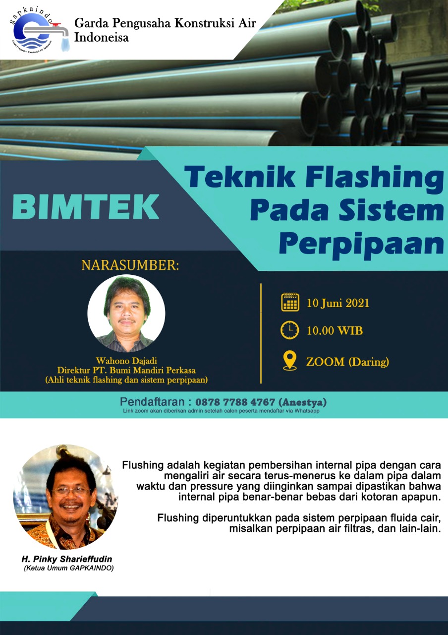 Undangan Zoom Bimbingan Teknik Flashing pada sistem perpipaanBimbingan Teknik Flashing pada sistem perpipaan (pembersihan pipa dengan menggunakan Kimia/Chemical). Narasumber : Bpk. Wahono Dajadi |