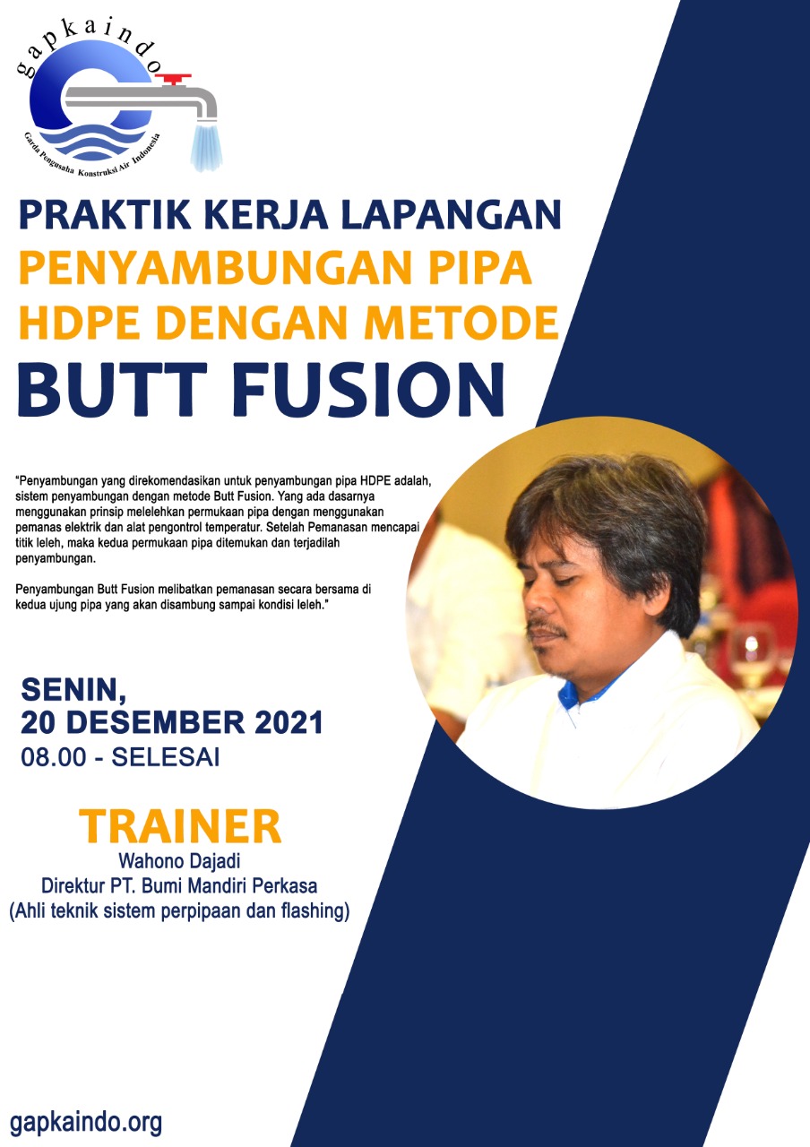 Undangan Praktik kerja lapangan penyambungan pipa hdpe dengan metode butt fusion.Hanya tersedia untuk 6 orang peserta khususnya Anggota Gapkaindo berlokasi di Riau, untuk praktik kerja lapangan penyambungan pipa hdpe dengan metode butt fusion. Trainer : Bpk. Wahono Dajadi ( Direktur PT. BMP sekaligus Ahli teknik sistem perpipaan dan flashing) |