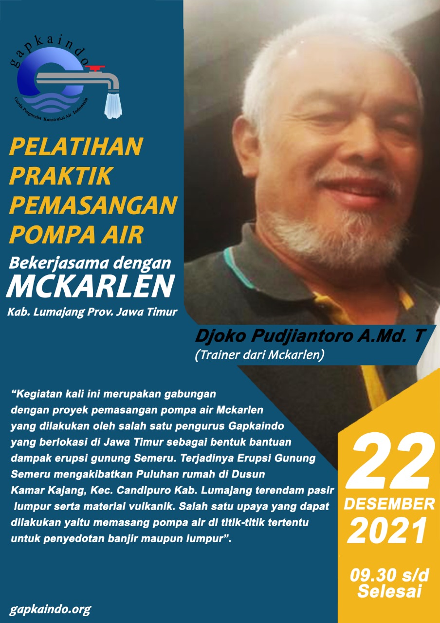 Undangan Pelatihan praktik pemasangan pompa air bekerjasama dengan Mckarlen.Gapkaindo menyediakan kuota sebanyak 8 Peserta khususnya anggota gapkaindo yang berada di Jawa Timur untuk Pelatihan praktik pemasangan pompa air bekerjasama dengan Mckarlen. Trainer : Bpk. Djoko Pudjiantoro. A.Md.T. |